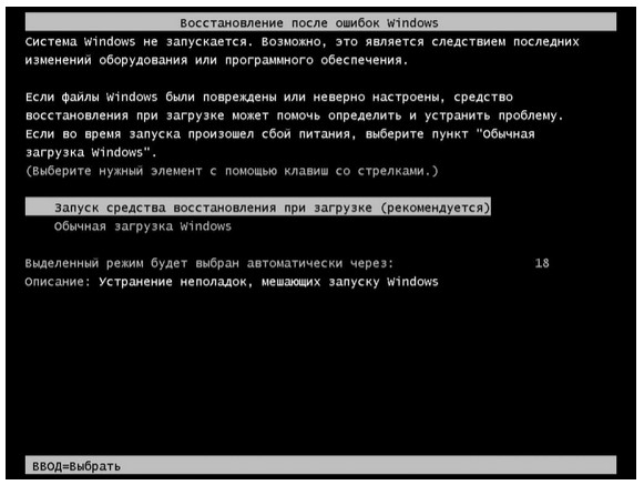 У Windows 7 автоматично завантажується відновлення системи під час завантаження. Це може бути незручно в системах, що працюють в автоматичному режимі, без присутності оператора і без наявності клавіатури (наприклад, системи групового відображення).