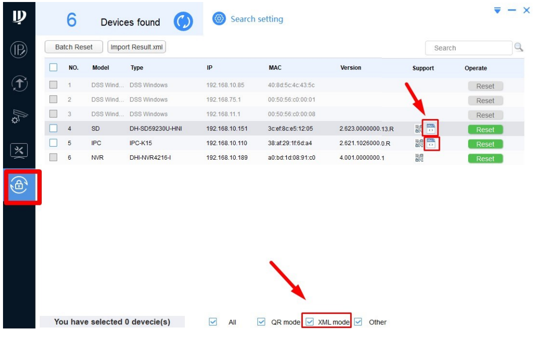 Цей спосіб перестав бути основним, т.к. не всі пристрої можуть підтримувати скидання пароля через XML-файл. Щоб дізнатися про підтримку такого методу скидання пароля, в утиліті Config Tool поставте галочку XML Mode і навпроти пристрою буде показано відповідну іконку.