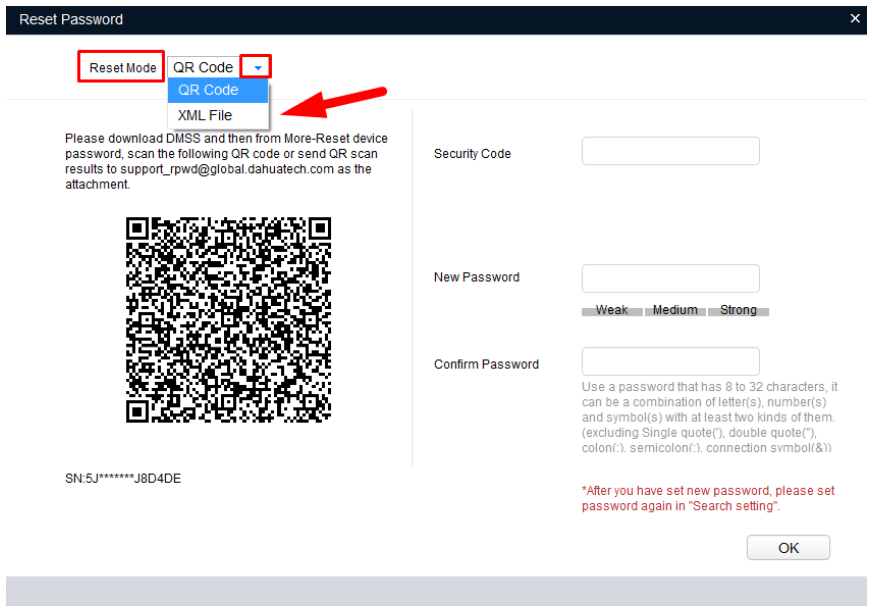 4. На Вашу пошту прийде повідомлення з темою “Password Reset”, де буде вказано код безпеки (Security Code), який потрібно ввести в полі на пристрої або утиліті Config Tool, після чого з'явиться можливість ввести новий пароль та підтвердити його. Цей варіант працює лише у випадку, якщо пристрій був прив'язаний до пошти власника.