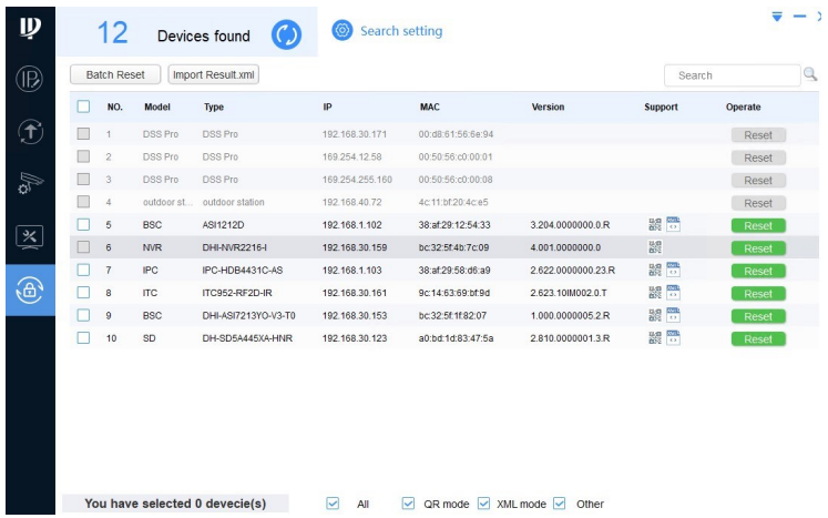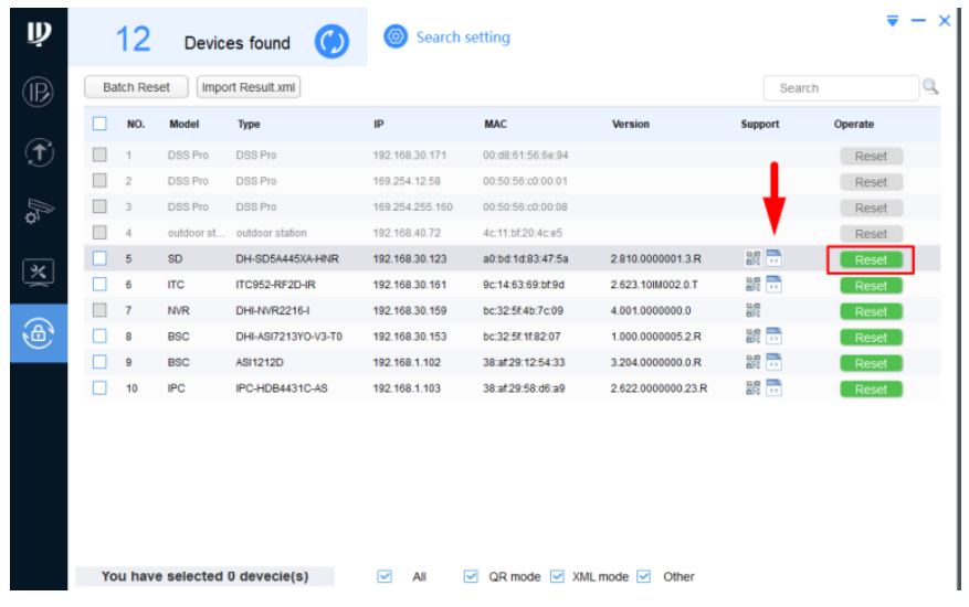 Також процедуру скидання пароля можна запустити через утиліту Config Tool. Для цього в утиліті потрібно знайти підключений пристрій та натиснути на зелену кнопку Reset. Після цього у всіх трьох випадках з'явиться вікно з QR-кодом, який потрібно відсканувати за допомогою смартфона із попередньо встановленим додатком DMSS.