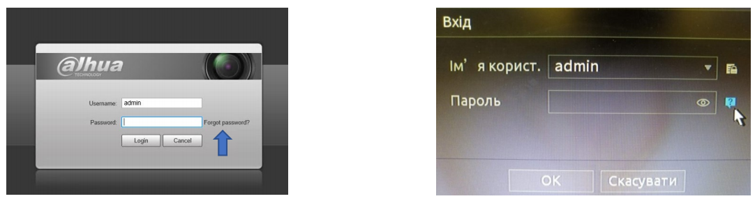 У web-інтерфейсі камер або графічному інтерфейсі підключеного до монітора відеореєстратора потрібно натиснути кнопку «Забули пароль» (Forgot Password англійською).
