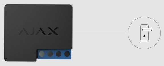 Relay Jeweller можна використовувати для блокування доступу в приміщення. Для цього потрібно встановити систему в режим охорони та замкнути електрозамок автоматично. Керувати живленням електрозамка також можливо в застосунку Ajax, натисканням Button Jeweller або за допомогою сценарію.