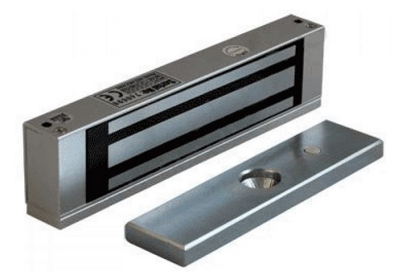 Такі замки складаються з блока з електромагнітом і металевої планки. Принцип роботи замка заснований на магнітному притягуванні. Блок з електромагнітом встановлюють на дверну коробку, а планку — на двері. У разі подання живлення замок притягує та втримує планку, замикаючи двері. За відсутності живлення електромагнітний замок відмикається.
