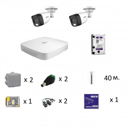 відеореєстратор - 1 шт./ камери 2Mp - 2 шт. / накопичувач 1Tb - 1 шт. / БЖ 12V/2A - 1 шт. / Розподільча коробка - 2 ш. / штекер DC - 2 шт. / ПРМ-ПРД - 2 шт. / кабель UTP зовн. 40 м. (по 20 м. на камеру) / наклейка "Увага ведеться відеоспостереження" - 1 шт