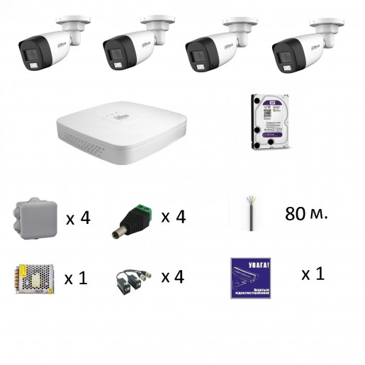 відеореєстратор - 1 шт./ камери 2Mp - 4 шт. / накопичувач 1Tb - 1 шт. / БЖ 12V/5A - 1 шт. / Розподільча коробка - 4 ш. / штекер DC - 4 шт. / ПРМ-ПРД - 4 шт. / кабель UTP зовн. 80 м. (по 20 м. на камеру) / наклейка "Увага ведеться відеоспостереження" - 1 шт