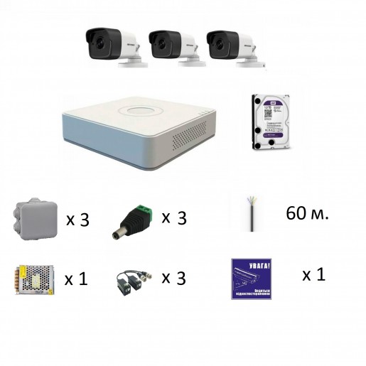 відеореєстратор - 1 шт./ камери 2Mp - 3 шт. / накопичувач 1Tb - 1 шт. / БЖ 12V/3A - 1 шт. / Розподільча коробка - 3 ш. / штекер DC - 3 шт. / ПРМ-ПРД - 3 шт. / кабель UTP зовн. 60 м. (по 20 м. на камеру) / наклейка "Увага ведеться відеоспостереження" - 1 шт