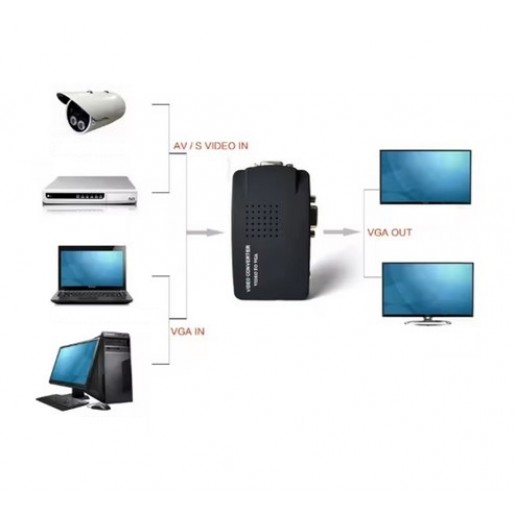 Дозволяє конвертувати RCA або S-Video сигнал у VGA; Дозволяє підключити відеоспостереження, DVD, реєстратор тощо. до VGA монітора; Канали введення перемикаються натисканням кнопки "Input"; Входи: RCA, BNC, S-Video; Вихід: VGA; Підтримка VGA виведення дозволів: 800x600@60HZ, 800X600@75HZ, 1024x768@60HZ, 1280x1024@HZ; Налаштування контрасту, яскравості, насиченості, колірного тону; Автовизначення PAL/NTSC; Функція заморожування екрану.